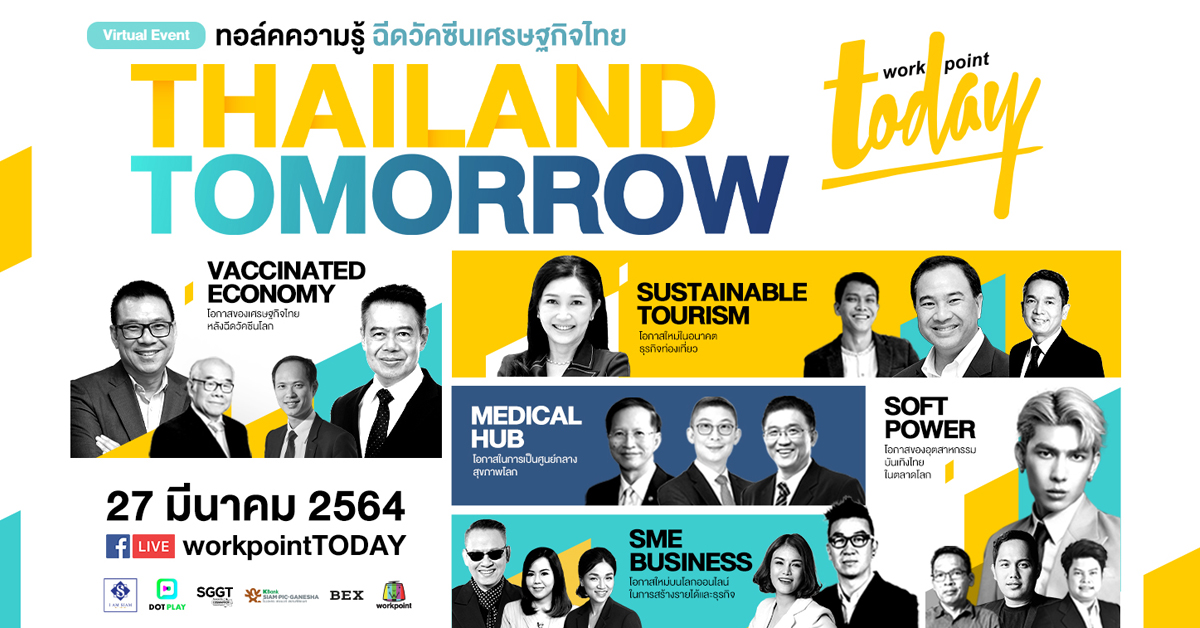 เวที ‘THAILAND TOMORROW ฉีดวัคซีนเศรษฐกิจไทย’ งานทอล์คความรู้เศรษฐกิจสุดพิเศษ ที่คุณไม่ควรพลาดการติดตาม สำหรับประชาชนทั่วไป สื่อมวลชน และผู้ที่สนใจในการเสริมสร้างศักยภาพและการพัฒนาตนเอง ธุรกิจ สังคม และประเทศชาติ สามารถชมบรรยากาศสดได้ตลอดทั้งวันพร้อมกัน วันเสาร์ที่ 27 มีนาคม 2564 (ไม่มีค่าใช้จ่าย) ทางเฟซบุ๊กและยูทูป workpointTODAY ตั้งแต่เวลา 10.00 น. เป็นต้นไป