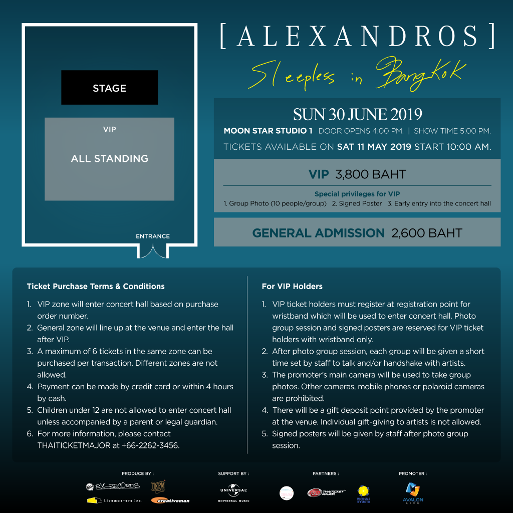 ย้ำกันอีกครั้ง เพื่อให้ไม่พลาด กับการแสดงสดที่สุดยอดของพวกเขา [ALEXANDROS] Sleepless in Bangkok ในวันอาทิตย์ที่ 30 มิถุนายน 2562 ณ Moon Star Studio 1 เตรียมตัวจองบัตรกันให้ดี โดยจะเปิดจำหน่ายบัตรทาง https://bit.ly/2V6Nn6Kและ Outlet ของTHAITICKETMAJOR ทุกสาขา ตั้งแต่วันเสาร์ที่ 11 พฤษภาคม2562 เวลา 10:00 น. เป็นต้นไป บัตรยืนทั้งหมด VIP ราคา 3,800บาท และ General Admissionราคา 2,600 บาท ติดตามรายละเอียดเพิ่มเติมทาง Facebook: AVALONLIVE, Twitter: @Officialavalon
