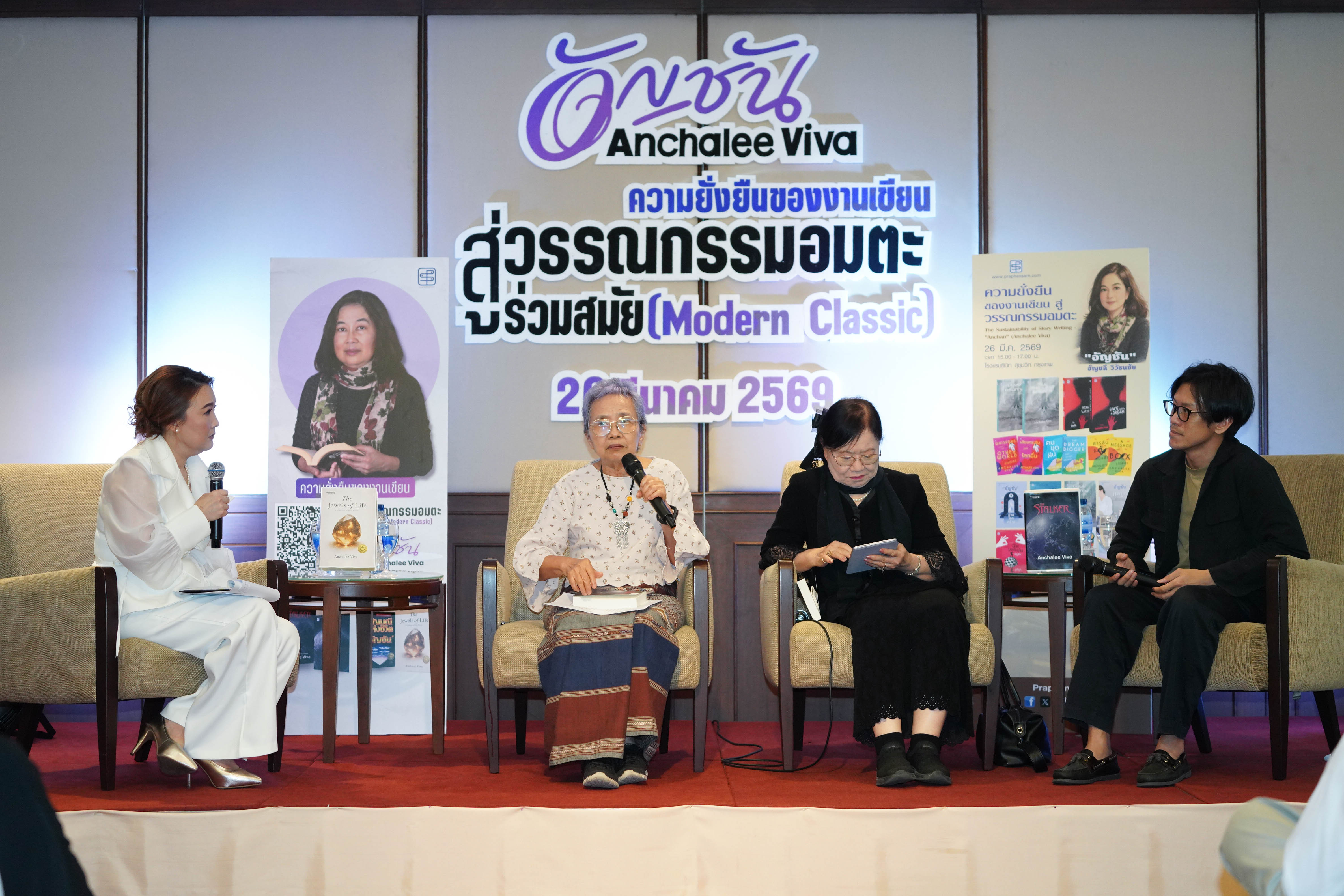ผ่านพ้นไปอย่างอบอุ่นสำหรับงานเสวนาทางวรรณกรรม “ความยั่งยืนของงานเขียน สู่วรรณกรรมอมตะร่วมสมัย (Modern Classic)” ซึ่งจัดขึ้นเมื่อวันที่ 26 มีนาคม 2569 ณ โรงแรมซีนิท สุขุมวิท กรุงเทพฯ โดยได้รับความสนใจจากสื่อมวลชน นักวิชาการ ตลอดจนผู้อ่านและแฟนหนังสือเข้าร่วมงานอย่างคับคั่ง สะท้อนพลังและความมีชีวิตชีวาของแวดวงวรรณกรรมไทยในปัจจุบัน หนึ่งในช่วงเวลาที่สร้างความประทับใจให้กับผู้เข้าร่วมงาน คือการปรากฏตัวของนักเขียนรางวัลซีไรต์ อัญชัน หรือ อัญชลี วิวัธนชัย ซึ่งเดินทางไกลมาจากประเทศสหรัฐอเมริกากว่า 20 ชั่วโมง ท่ามกลางสถานการณ์ความไม่สงบในหลายพื้นที่ของโลกในช่วงเวลานี้ แต่ยังคงมาพร้อมรอยยิ้มและความตั้งใจเต็มเปี่ยม เพื่อร่วมเปิดตัวผลงานใหม่และพบปะผู้อ่านชาวไทยอย่างใกล้ชิด สร้างบรรยากาศอบอุ่นและเป็นกันเองตลอดทั้งงาน