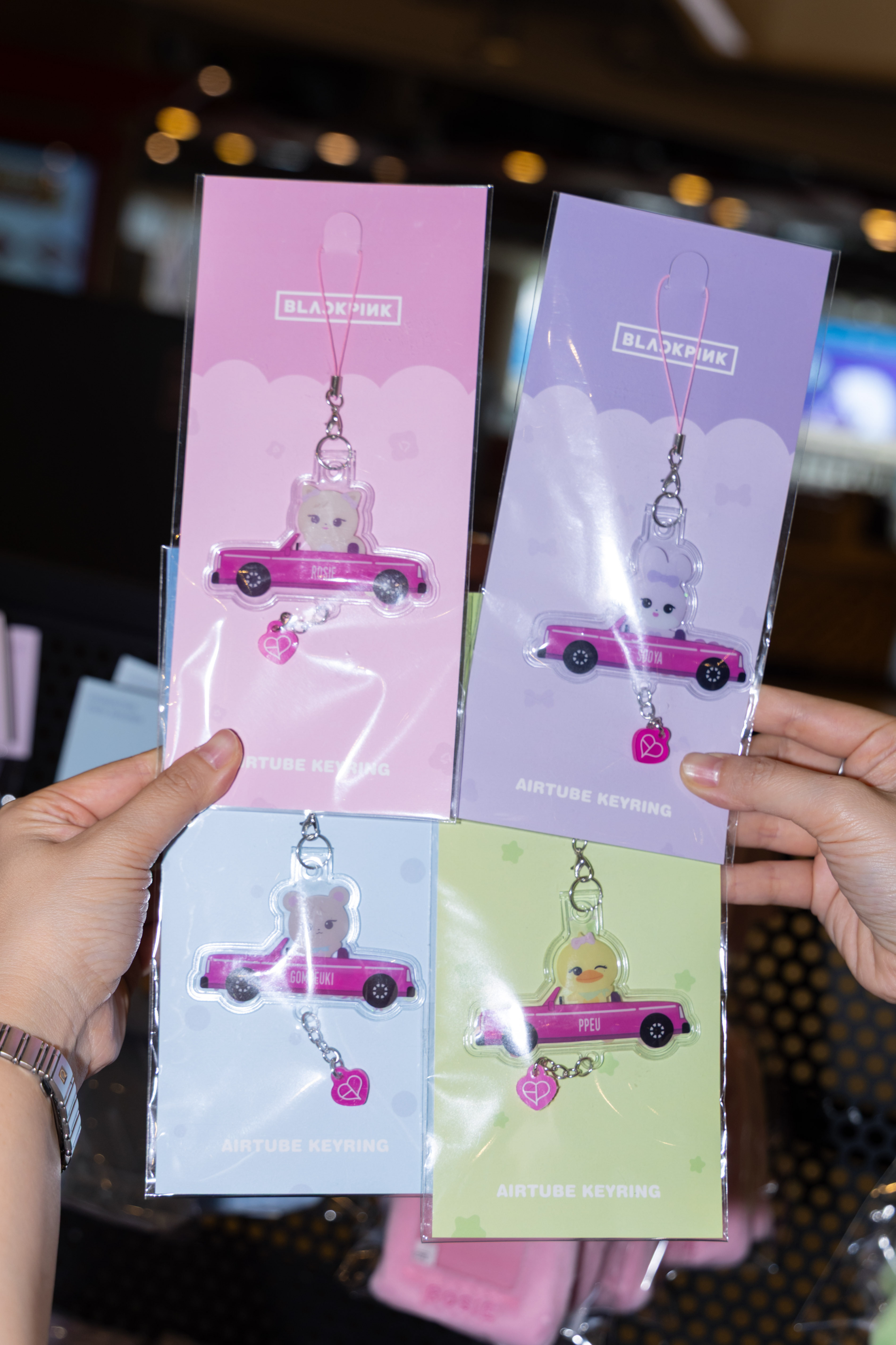รวมถึงพวงกุญแจ PLUSH KEYRING ดีไซน์ขายาว และ PLUSH KEYRING ทรงสลิม, CAR POUCH กระเป๋าใส่ของสีชมพูทรงรถ, ที่คาดผม BLACKPINK CHARACTER HEADBAND ดีไซน์น่ารักสะดุดตา, เข็มกลัด FACE MINI BADGE, CARD HOLDER
