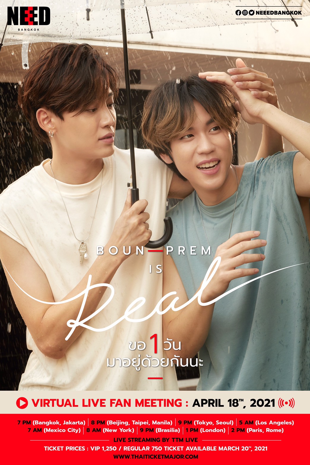 NEEED Bangkok เปิดขายบัตรอย่างเป็นทางการแล้ววันนี้ (20 มีนาคม 2564) เวลา 10.00 น. กับงาน ‘BOUNPREM is REAL ขอ 1 วันมาอยู่ด้วยกันนะ’ Virtual Live Fan Meeting ครั้งแรกของคู่จิ้นสุดฮอต #บุ๋นเปรม ที่จะชวนคุณมาอยู่ด้วยกันใน 1 วันแสนพิเศษ