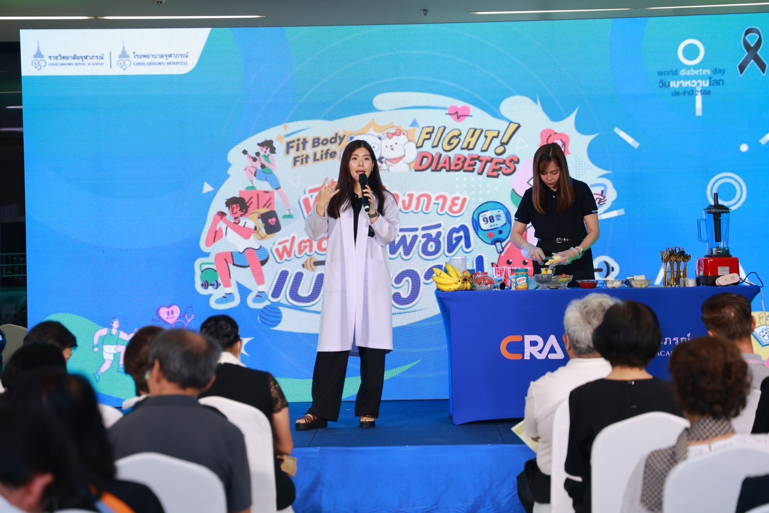 กรุงเทพฯ : 14 พฤศจิกายน 2568 จากสถานการณ์ปัจจุบันมีผู้ป่วยโรคเบาหวานเพิ่มขึ้นและมีแนวโน้มเพิ่มขึ้นทั่วโลก รวมถึงประเทศไทย ดังนั้น คลินิกเบาหวานและโรคเมตาบอลิก โรงพยาบาลจุฬาภรณ์ ราชวิทยาลัยจุฬาภรณ์ จึงได้จัดกิจกรรม วันเบาหวานโลก ประจำปี 2568 “ฟิตร่างกาย ฟิตชีวิต พิชิตเบาหวาน” เพื่อสร้างความตระหนักรู้และความสำคัญเกี่ยวกับโรคเบาหวานซึ่งเพิ่มขึ้นอย่างมาก พร้อมเชิญชวนให้ประชาชนร่วมกันตรวจสุขภาพโรคเบาหวานประจำปี เพื่อตรวจเช็กร่างกายของตนเองอย่างสม่ำเสมอ ทั้งยังช่วยสร้างแรงบันดาลใจให้ทุกคนเห็นคุณค่าของการป้องกันโรคเบาหวาน และหันมาใส่ใจสุขภาพของตนเอง เพราะ “การป้องกันที่ดีที่สุด คือการเริ่มต้นดูแลตัวเองตั้งแต่วันนี้” โดยมี รศ.นพ.สุรศักดิ์ ลีลาอุดมลิปิ รักษาการผู้อำนวยการโรงพยาบาลจุฬาภรณ์ เป็นประธานเปิดงาน พร้อมด้วยทีม แพทย์เฉพาะทางด้านอายุรศาสตร์ ต่อมไร้ท่อและเมตาบอลิก นักวิทยาศาสตร์การกีฬา และนักกำหนดอาหารวิชาชีพเข้าร่วมในงาน ณ ชั้น 1 อาคารกรมพระศรีสวางควัฒน โรงพยาบาลจุฬาภรณ์ ราชวิทยาลัยจุฬาภรณ์ เขตหลักสี่ กรุงเทพฯ