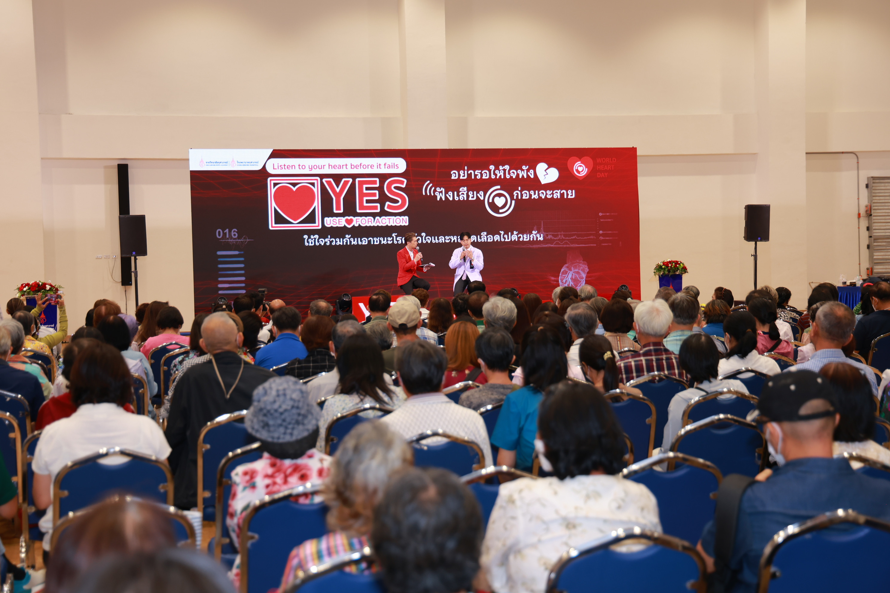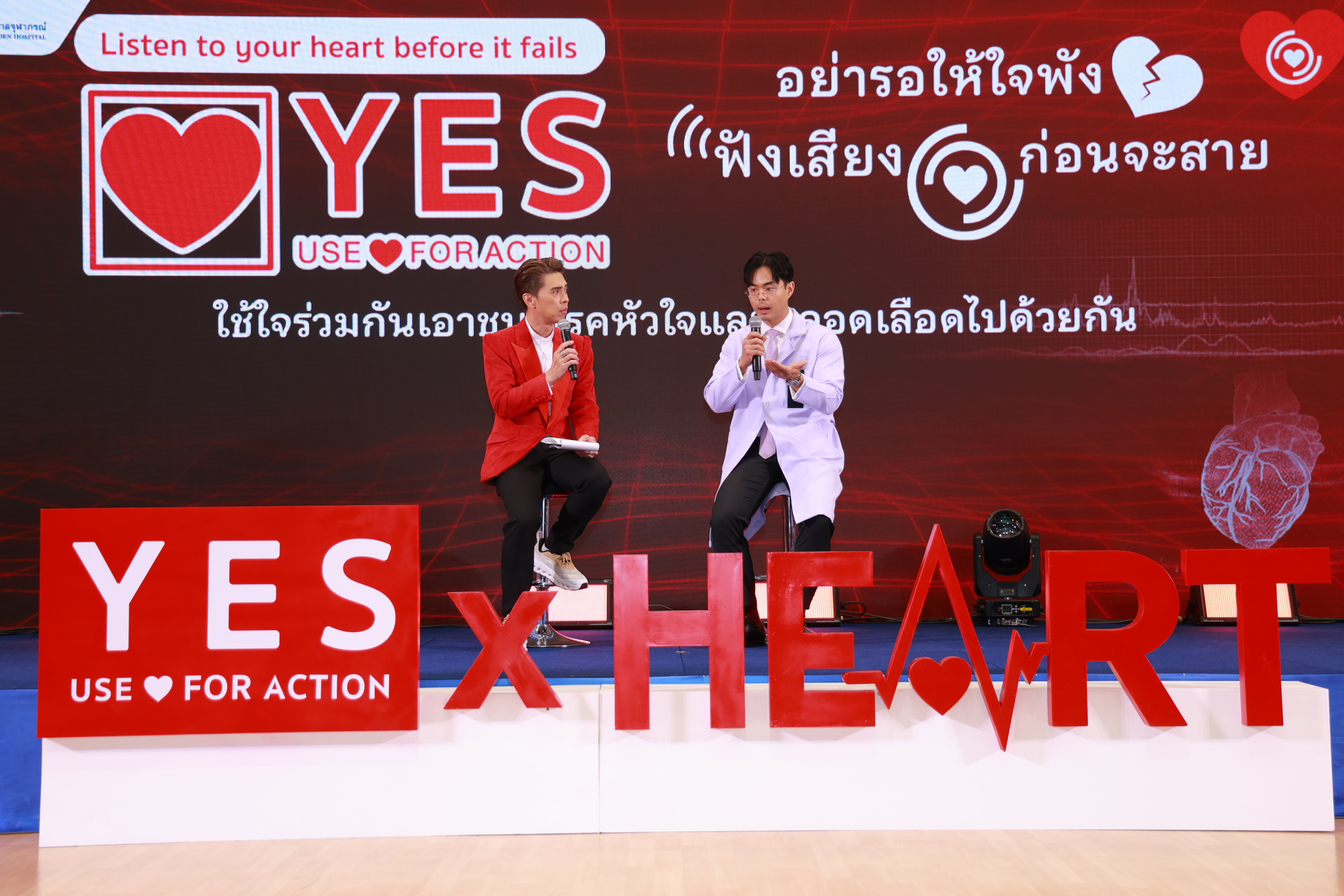 ภายในงานนอกจากการถ่ายทอดองค์ความรู้ทางการแพทย์จากทีมแพทย์ทั้งหมดแล้ว ยังได้รับการถ่ายทอดประสบการณ์จากผู้ป่วยที่ได้รับการเปลี่ยนลิ้นหัวใจเอออร์ติก (TAVR) พร้อมทั้งพูดคุยกับพระเอกหนุ่ม สมิธ-ภาสวิชญ์ บูรณนัติ ที่มาร่วมทอล์กส่งต่อพลังบวกสร้างพลังใจให้กับผู้ป่วย โดยมี ดีเจเอกกี้–เอกชัย เอื้อสังคมเศรษฐ ร่วมดำเนินรายการเติมเต็มบรรยากาศให้มีความสุข สนุกและอบอุ่นสร้างพลังใจให้กับทุกคนที่มาร่วมงานอย่างเต็มที่ พร้อมทั้งร่วมรณรงค์ส่งเสริมการดูแลสุขภาพหัวใจคนไทยให้แข็งแรงด้วยการชวนกันลุกขึ้นมาออกกำลังและร่วมเป็นสะพานบุญเชื่อมต่อทุกหัวใจให้แข็งแรงด้วยหัวใจแห่งการให้ ผ่านการร่วมบริจาคสมทบทุนมูลนิธิศรีสวางควัฒน ในพระอุปถัมภ์ฯ เพื่อช่วยเหลือผู้ป่วยให้สามารถเข้าถึงการรักษาโรคลิ้นหัวใจผ่านสายสวน ได้ที่บัญชี ธนาคารกรุงเทพ เลขที่ 942-300099-2 ศูนย์หัวใจและหลอดเลือด โรงพยาบาลจุฬาภรณ์ ยังคงเดินหน้าด้วยพันธกิจในการยกระดับคุณภาพการรักษาโรคหัวใจของประเทศไทยสู่มาตรฐานสากล ควบคู่ไปกับการสร้างความตระหนักรู้ด้านการดูแลสุขภาพหัวใจโดยมุ่งหวังให้คนไทยทุกคนมีสุขภาพหัวใจที่แข็งแรงอย่างยั่งยืน