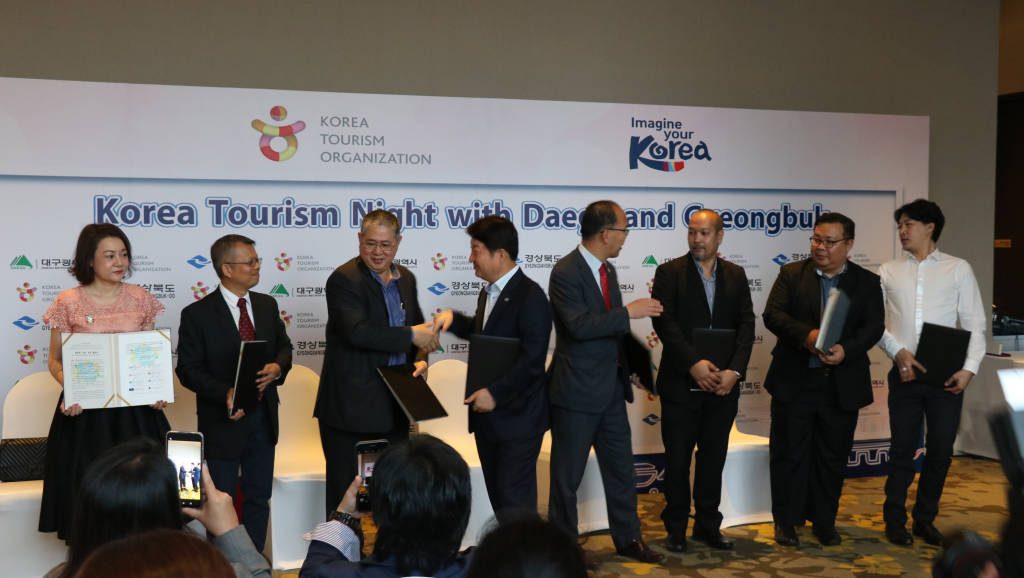 กรุงเทพมหานคร – เมื่อวันพฤหัสบดีที่ 23 พฤษภาคมที่ผ่านมา นายกเทศมนตรีเมืองแทกู Kwon Young-jin และผู้ว่าราชการ Yoon Jong-jin ของจังหวัดคยองบุก ได้ทำพิธีลงนามความร่วมมือ MOU กับบริษัททัวร์ชั้นนำของประเทศไทย และ บริษัทผู้จัดละครของไทยรวมทั้งยังได้เชิญชวนอุตสาหกรรมการท่องเที่ยวในท้องถิ่นกว่า 150 แห่งเพื่อแนะนำแหล่งท่องเที่ยวจังหวัดแทกู และเมืองคยองบุก ณ โรงแรมเรดิสัน บลู