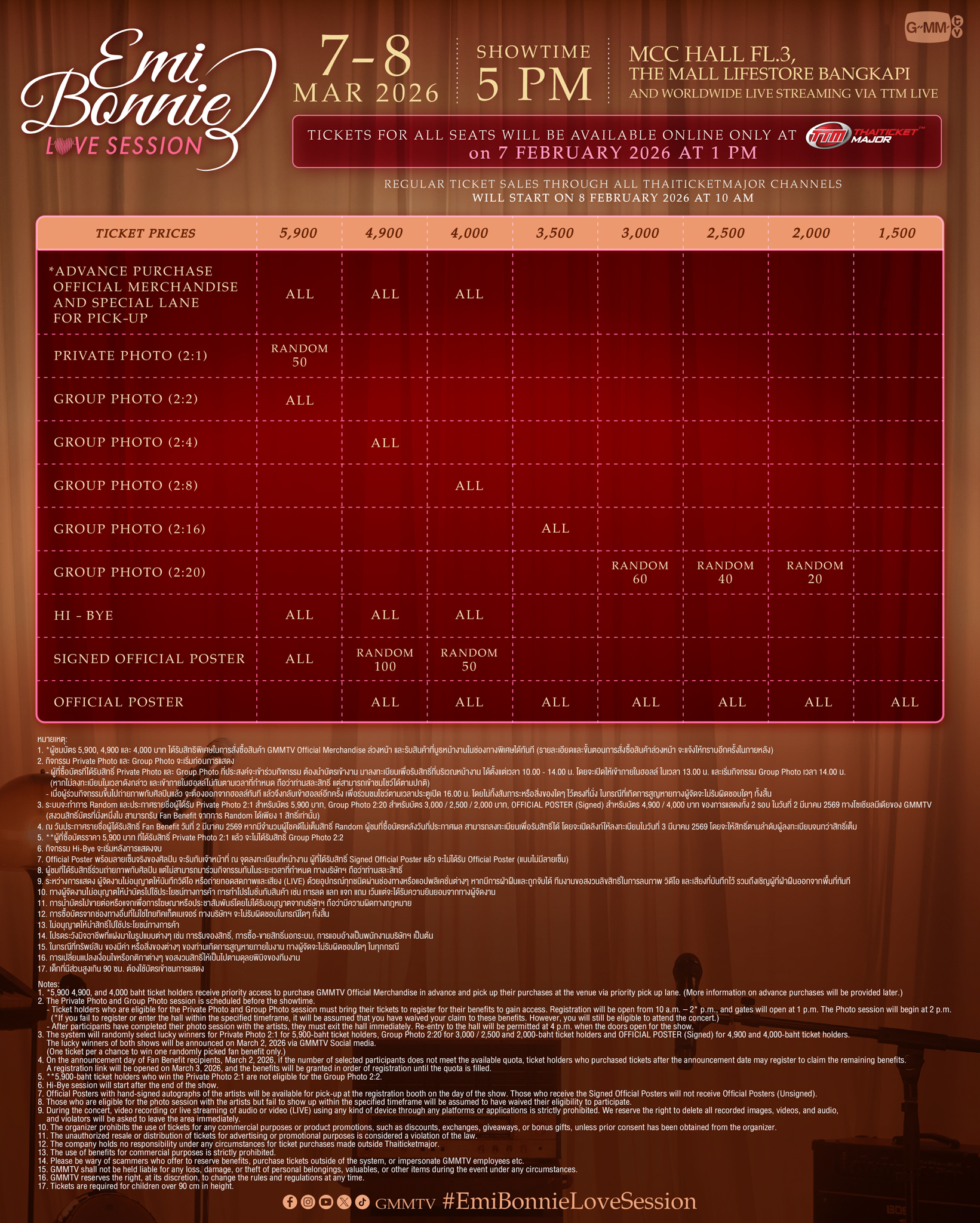 SESSION” โดยจะเปิดจำหน่ายบัตรบนช่องทาง Online ในวันเสาร์ที่ 7 กุมภาพันธ์นี้ ทาง www.thaiticketmajor.com เท่านั้น เวลา 13.00 น. เป็นต้นไป และเปิดจำหน่ายบัตรทุกช่องทางตามปกติ ในวันอาทิตย์ที่ 8 กุมภาพันธ์ 2569 เวลา 10.00 น. เป็นต้นไป ทางไทยทิคเก็ตเมเจอร์ทุกสาขา, www.thaiticketmajor.com และ Call center โทร 0-2262-3456 บัตรราคา 5,900 / 4,900 / 4,000 / 3,500 / 3,000 / 2,500 / 2,000 / 1,500 บาท และดูสดผ่าน “TTM LIVE” บัตรราคา 1,500 / 1,200 บาท (ลิงค์และโค้ดรับชม) (กรณีต้องการรับบัตรพลาสติกที่ระลึก ชำระเพิ่ม 30/ใบ) และติดตามรายละเอียดเพิ่มเติมได้ที่www.thaiticketmajor.com และ Facebook / Instagram / X / TikTok / YouTube / Weibo: GMMTV