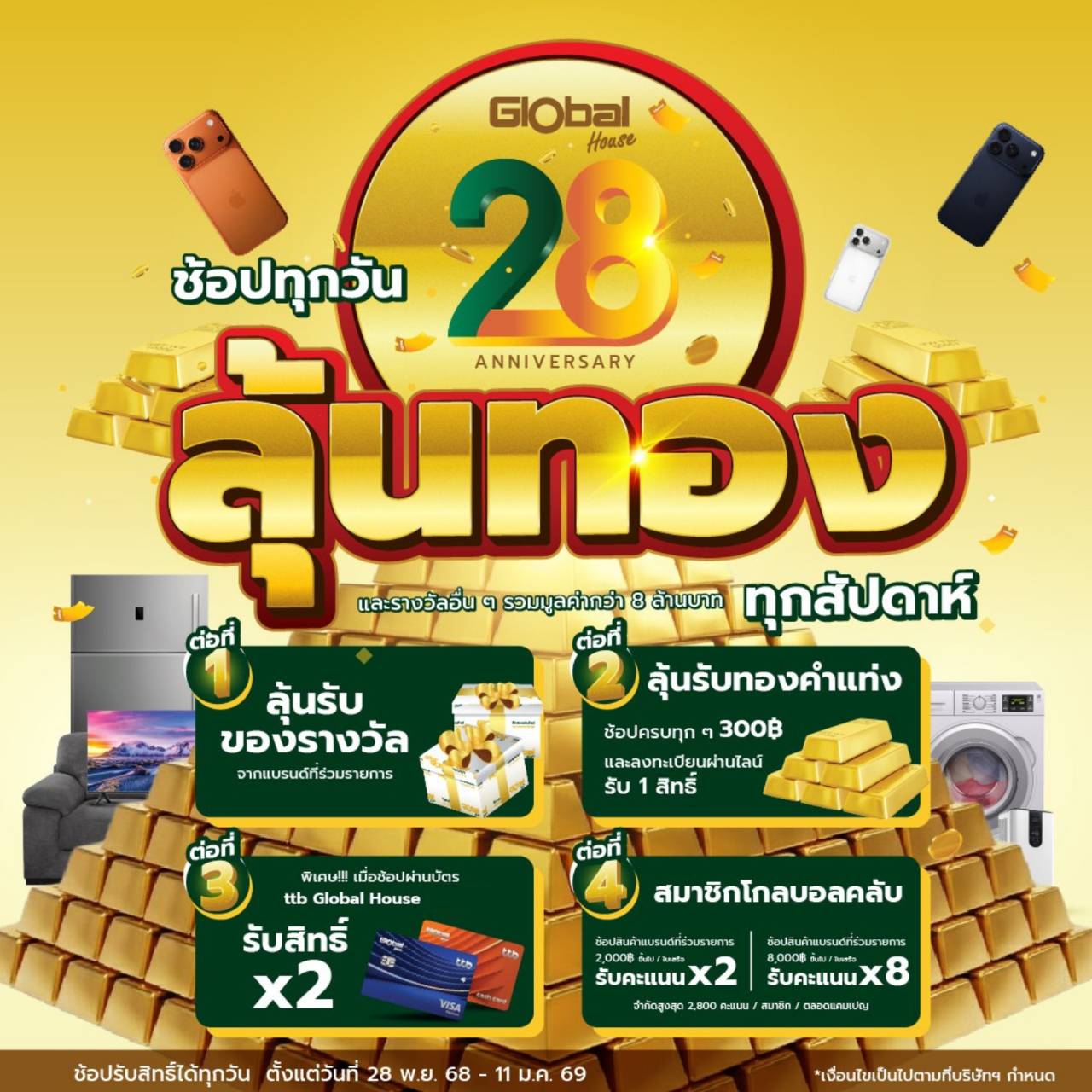 โกลบอลเฮ้าส์ขอเชิญชวนลูกค้าสมาชิกโกลบอลคลับทุกท่าน ร่วมเป็นส่วนหนึ่งในแคมเปญ “28 ปี โกลบอลเฮ้าส์ ช้อปทุกวัน ลุ้นทอง ทุกสัปดาห์ และรางวัลอื่นๆ รวมมูลค่ากว่า 8 ล้านบาท” เพื่อแสดงความขอบคุณลูกค้าทุกท่านที่ให้การสนับสนุนและไว้วางใจเรามาโดยตลอดระยะเวลาที่ผ่านมา