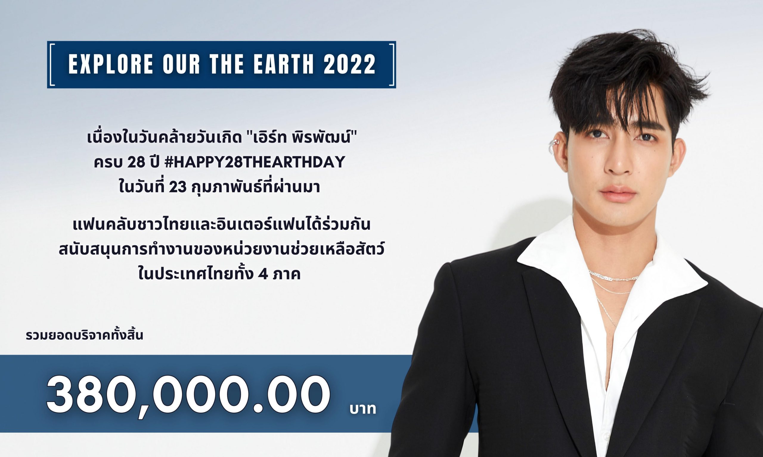 เนื่องในวันคล้ายวันเกิด เอิร์ท พิรพัฒน์ วัฒนเศรษสิริ ครบ 28 ปี #Happy28thEarthDay ในวันที่ 23 กุมภาพันธ์ที่ผ่านมา แฟนคลับชาวไทยและอินเตอร์แฟนร่ วมกันสนับสนุนการทำงานของหน่ วยงานช่วยเหลือสัตว์ ในประเทศไทยทั้ง 4 ภาค รวมยอดบริจาคทั้งสิ้น 380,000 บาท (สามแสนแปดหมื่นบาทถ้วน)