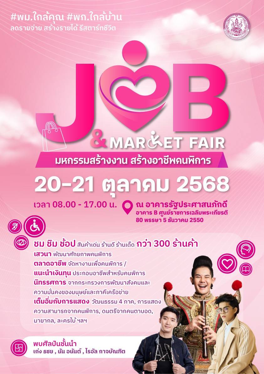 อย่างไรก็ตาม ขอเชิญชวนพี่น้องประชาชนร่วมให้กำลังใจ ให้โอกาสแก่คนพิการ ได้ก้าวข้ามข้อจำกัดความพิการ และก้าวสู่ชีวิตใหม่อย่างมั่นคง สู่สังคมที่ไม่ทิ้งใครไว้ข้างหลัง ในงาน Job and Market Fair : มหกรรมสร้างงาน สร้างอาชีพคนพิการ” ระหว่างวันที่ 20 – 21 ตุลาคม 2568 ณ อาคารรัฐประศาสนภักดี (อาคาร B) ศูนย์ราชการเฉลิมพระเกียรติ 80 พรรษาฯ กรุงเทพฯ