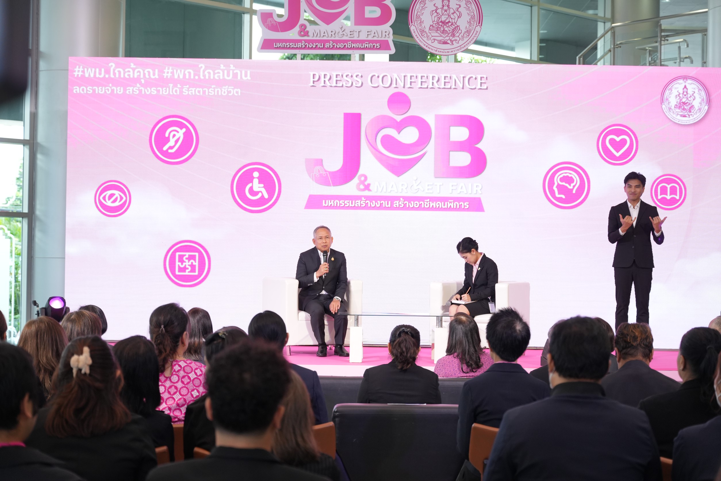 วันที่ 10 ตุลาคม 2568 เวลา 13.30 น. นายกันตพงศ์ รังษีสว่าง ปลัดกระทรวงการพัฒนาสังคมและความมั่นคงของมนุษย์ (ปลัด พม.) เป็นประธานงานแถลงข่าวการจัดงาน “Job and Market Fair : มหกรรมสร้างงาน สร้างอาชีพคนพิการ” ภายใต้นโยบาย “พม.ใกล้คุณ” โดย นายอัครา พรหมเผ่า รัฐมนตรีว่าการกระทรวงการพัฒนาสังคมและความมั่นคงของมนุษย์ (รมว.พม.) ซึ่งจัดโดยกรมส่งเสริมและพัฒนาคุณภาพชีวิตคนพิการ (พก.) กระทรวงการพัฒนาสังคมและความมั่นคงของมนุษย์ (พม.) ระหว่างวันที่ 20 – 21 ตุลาคม 2568 ณ อาคารรัฐประศาสนภักดี (อาคาร B) ศูนย์ราชการเฉลิมพระเกียรติ 80 พรรษาฯ กรุงเทพฯ เพื่อให้กลุ่มเปราะบางได้รับการช่วยเหลืออย่างเป็นระบบ ด้วยการเข้าถึงสิทธิประโยชน์ที่พึงมี และสามารถ “ตั้งหลักใหม่” เพื่อก้าวต่อไปอย่างมั่นคง โดยมี นางสาวสนธยา บุณยภูษิต อธิบดีกรมส่งเสริมและพัฒนาคุณภาพชีวิตคนพิการ พร้อมด้วย คณะผู้บริหารกระทรวง พม. คนพิการ ครอบครัวคนพิการ องค์กรคนพิการ อาสาสมัคร เครือข่ายเอกชน เข้าร่วมงานแถลงข่าว ณ บริเวณโถง ชั้น 1 อาคารกรมพัฒนาสังคมและสวัสดิการ สะพานขาว กรุงเทพฯ