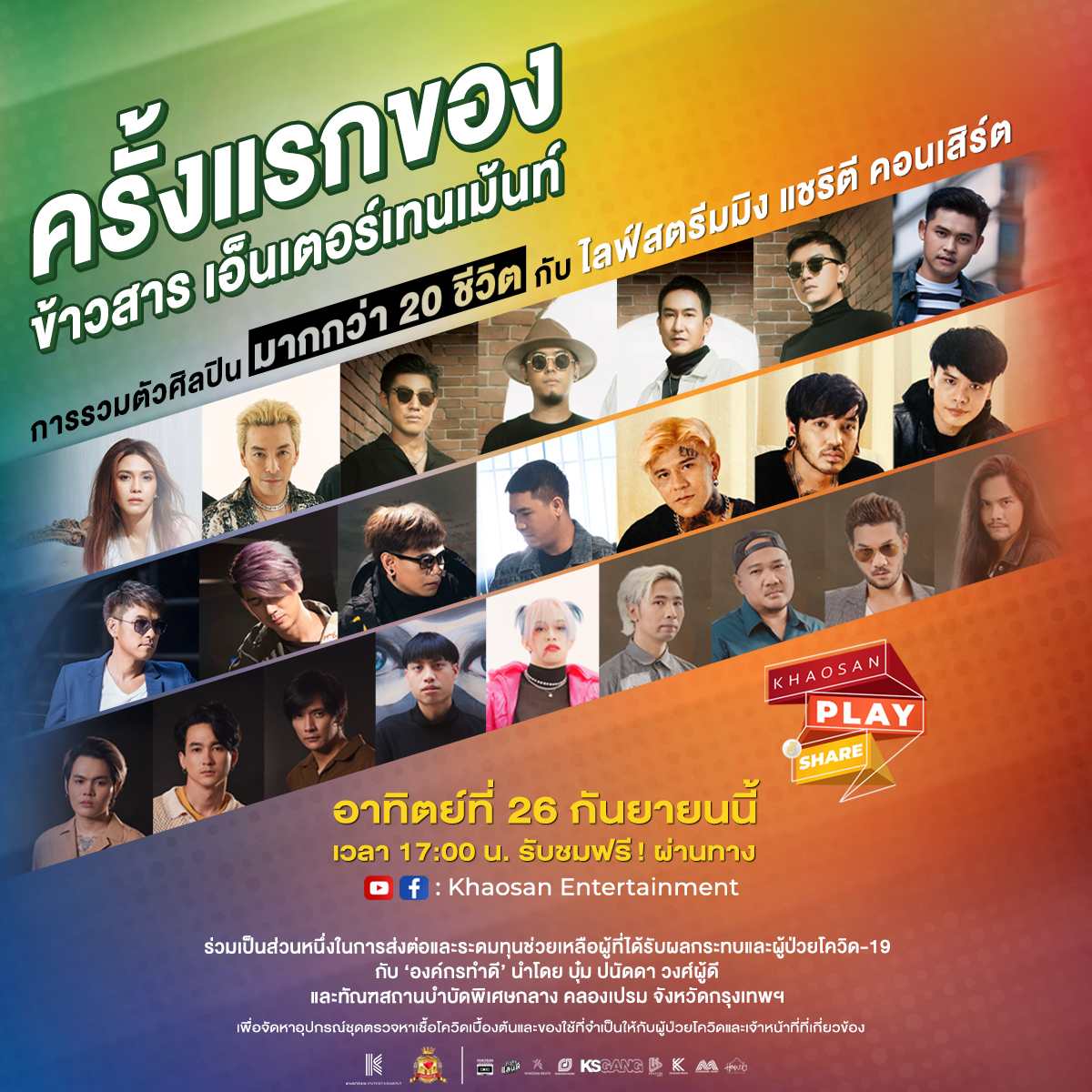 สำหรับงานคอนเสิร์ต “KHAOSAN PLAY TO SHARE” ถ่ายทอดสดในวันอาทิตย์ที่ 26 กันยายน 2564 ตั้งแต่เวลา 17.00 น. เป็นต้นไป แฟนๆ สามารถเป็นส่วนหนึ่งในการร่
