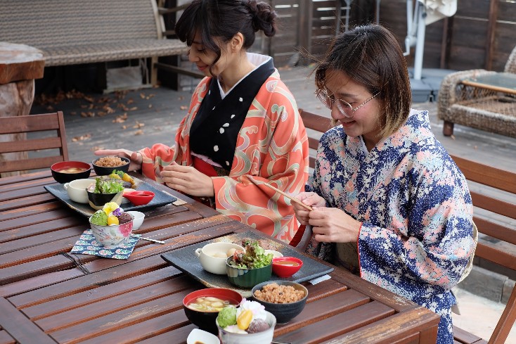 ร้านคาเฟ่ ที่ภายในร้านมีชุดกิโมโนและยูกาตะมากมาย เพียงแค่ทานอาหารในร้าน ทางร้านยินดีให้บริการสวมกิโมโนฟรี สามารถใส่ถ่ายรูปในร้านหรือเดินเที่ยวเล่นบริเวณใกล้เคียงเพื่อถ่ายรูปได้ทั้งวัน ในส่วนอาหารเป็นข้าวกล้องเอนไซม์ผสมถั่วแดง รสชาติอร่อยและดีต่อสุขภาพ และยังมีขนมหวานแบบญี่ปุ่นดั้งเดิมให้ลิ้มลอง อีกทั้งมีสื้อผ้า กระเป๋า แบรนด์ที่ไม่สามารถหาซื้อได้ที่ร้านค้าอื่น ๆ ที่คุณสามารถเพลิดเพลินกับการแต่งตัว ซื้อของ ทานอาหาร ได้อย่างดี