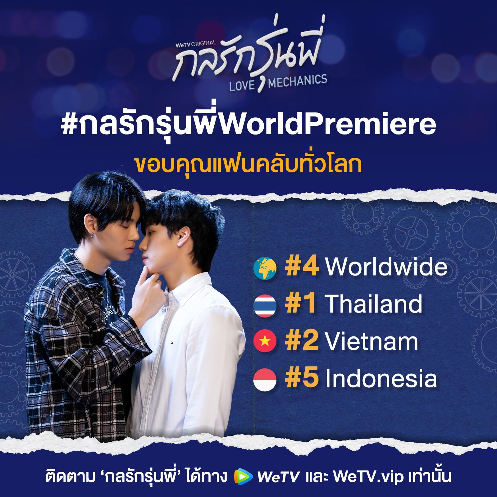 เปิดมาเพียง EP.แรก ก็สุดปัง สำหรับซีรีส์จากโปรเจค WeTV Original เรื่อง “กลรักรุ่นพี่ LOVE MECHANICS” ที่ออนแอร์ให้แฟนๆ ได้ชมกันไปเมื่อวันเสาร์ ที่ 18 มิถุนายนที่ผ่านมาทางแอปพลิเคชั่น WeTV ซึ่งในวันนั้นเรียกว่าพิเศษสุด ๆ ที่นอกจากแฟนๆ จะได้ชมความฟินพร้อมกันทั่วโลกแล้ว ทางคู่จิ้นสุดฮอต “หยิ่น อานันท์” และ “วอร์ วนรัตน์” ยังได้จัดกิจกรรมแบบเอ็กซ์คลูซีฟ ควงแขนแฟนๆ ชม EP.แรก พร้อมกันแบบใกล้ชิด ที่ฟินทั้งในจอและนอกจอกันเลยทีเดียว เรียกว่าทำเอาทวิตเตอร์แตก เพราะแฮทแท็ก #กลรักรุ่นพี่WorldPremiere พุ่งทะยานติดเทรนด์ทวิตเตอร์อันดับ 1 ของไทย และอันดับ 4 ของโลก แถมที่สำคัญยังติดเทรนด์ทวิตเตอร์อีกหลายๆ ประเทศ งานนี้ทำเอา “หยิ่น – วอร์” ออกอาการปลื้มใจสุด ๆ