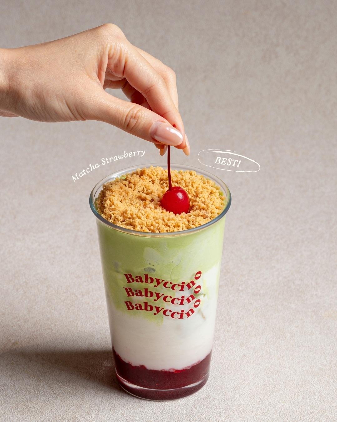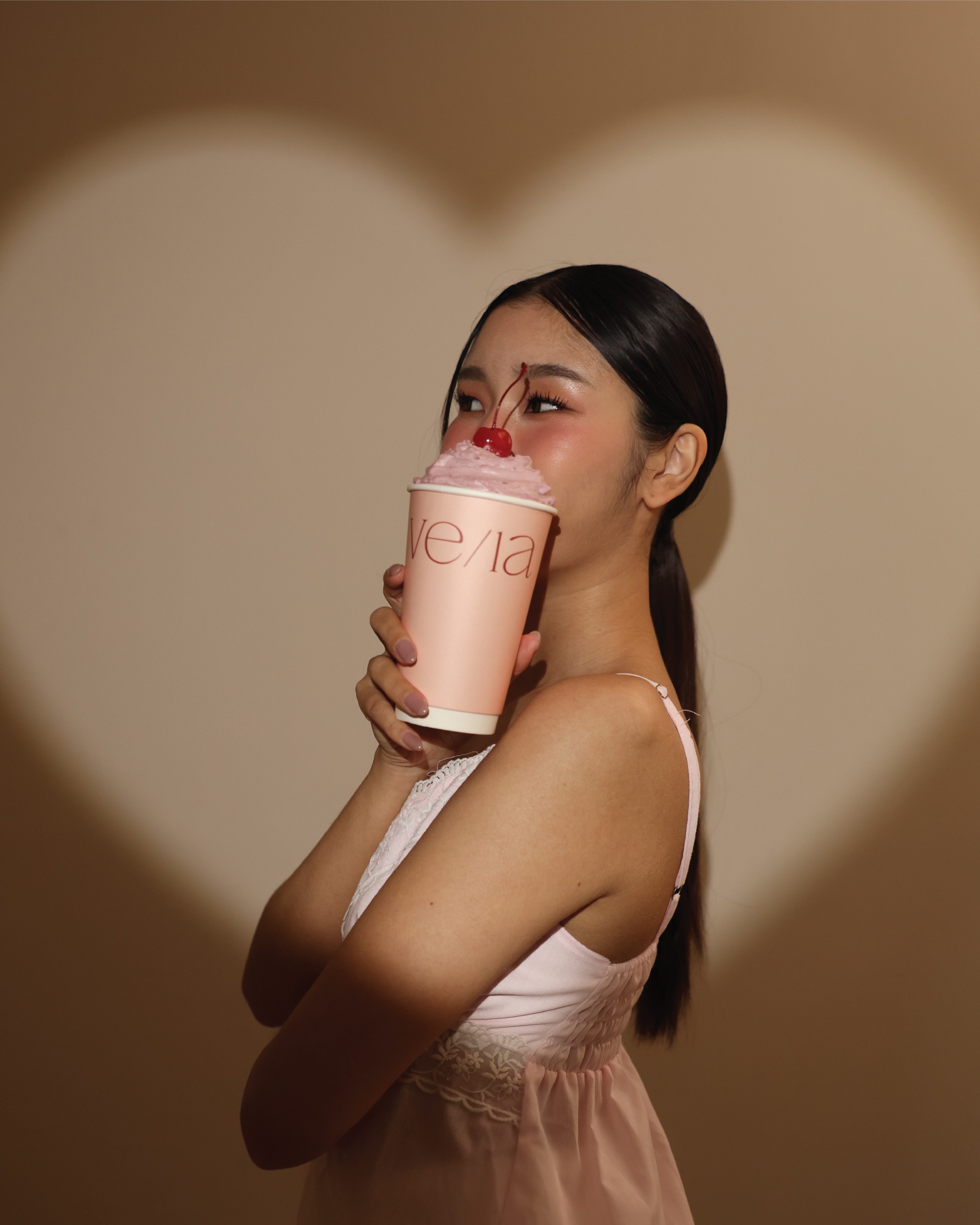 ตามด้วย VE/LA กับ Cherry on Top Latte เครื่องดื่มสีชมพูที่ชวนตกหลุมรักตั้งแต่แรกเห็น ผสานลาเต้รสนุ่มเข้ากับครีมเชอร์รีโฮมเมดและมาราชิโนเชอร์รี ให้ความรู้สึกหวาน สดชื่น และละมุนอย่างพอดี ที่ VE/LA ชั้น M