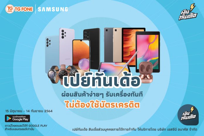เปย์ทันเด้อ โดยแคมเปญนี้จะมาช่วยตอบโจทย์ผู้บริโภคที่กำลังมองหาสมาร์ทโฟนและดีไวซ์อื่นๆ ในตระกูลกาแลคซี่ ด้วยวิธีการผ่อนชำระแบบไม่ต้องใช้บัตรเครดิต พร้อมกันนี้ ยังมอบความสะดวกสบายให้กับลูกค้าด้วยช่องทางจำหน่ายที่ร้าน TG FONE และ Samsung Experience Store, Samsung Service ที่บริหารโดย TG FONE รวมกว่า 134 สาขา รวมถึงช่องทางออนไลน์อีกหลากหลายแพลตฟอร์ม ซึ่งสอดคล้องกับไลฟ์สไตล์ Touchless Society ในยุคปัจจุบัน ที่ผู้บริโภคสามารถทำธุรกรรมทางการเงินเพื่อยื่นขอสินเชื่อผ่อนชำระสินค้า และเลือกซื้อสินค้าออนไลน์ได้จากที่บ้านเพื่อลดการเดินทางและการสัมผัสอีกด้วย