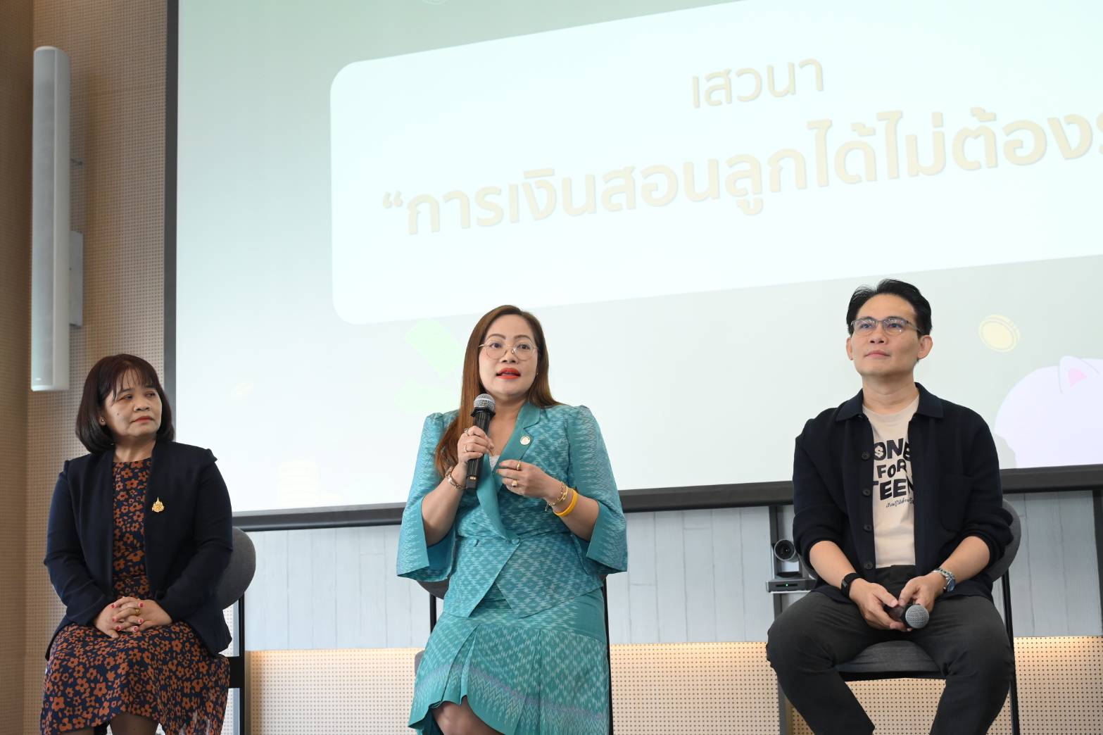 ภายในงานเปิดตัวหลักสูตร “Money for Teen เรื่องเงินเรียนรู้ได้ตั้งแต่วัยรุ่น” ยังมีการจัดเสวนาในหัวข้อ “การเงินสอนลูกได้ไม่ต้องรอ” เปิดเวทีแลกเปลี่ยนมุมมองจากผู้ทรงคุณวุฒิหลากหลายภาคส่วนถึงแนวทางการส่งเสริมความรู้ทางการเงินในครอบครัว และการขยายหลักสูตรเข้าสู่สถานศึกษาทั่วประเทศ โดยมีผู้ร่วมเสวนา ได้แก่ โค้ชหนุ่ม – คุณจักรพงษ์ เมษพันธุ์ The Money Coach คุณพุทธวรรณ สุภัทรนันท์ ผู้อำนวยการฝ่ายสื่อสารองค์กร Sea (ประเทศไทย) ดร.เกศทิพย์ ศุภวานิช อธิบดีกรมส่งเสริมการเรียนรู้ (สกร.) และคุณจรูญศรี แจบไธสง รองผู้อำนวยการสำนักวิชาการและมาตรฐานการศึกษา สํานักงานการศึกษาขั้นพื้นฐาน (สพฐ.) พร้อมแขกรับเชิญพิเศษอย่าง คุณเบลล์ – ยุภาพร ฤทธิญาณ อินฟลูเอนเซอร์ชื่อดัง (คุณแม่น้องชูใจ) ที่มาร่วมแบ่งปันประสบการณ์การสอนลูกเรื่องการเงินในชีวิตจริง