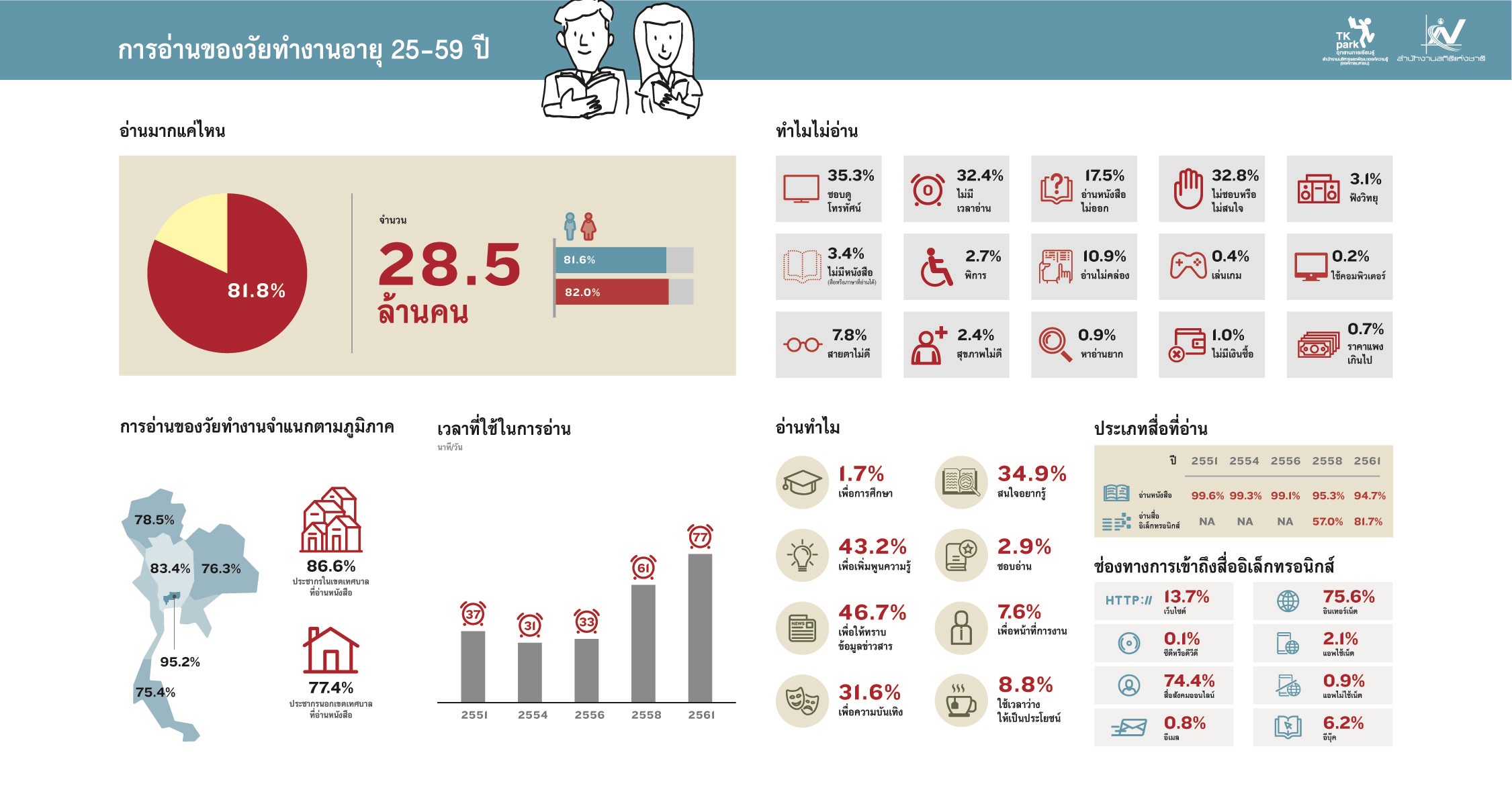 “อย่างไรก็ดี อุทยานการเรียนรู้TK park เห็นว่าแม้จะมีตัวเลขคนอ่านเพิ่มขึ้นร้อยละ 78.8 ก็ตาม แต่เมื่อมองไปที่ตัวเลขของกลุ่มที่ไม่อ่าน พบว่ามีถึงร้อยละ 21.2 คิดเป็นจำนวนประชากร 13.7 ล้านคน ซึ่งเหตุผลของการไม่อ่าน มีตั้งแต่การดูทีวี ไม่มีเวลา อ่านไม่ออก ไม่ชอบ ไม่สนใจการอ่าน ชอบเล่นเกม รวมทั้งไม่มีเงินซื้อหนังสือ”