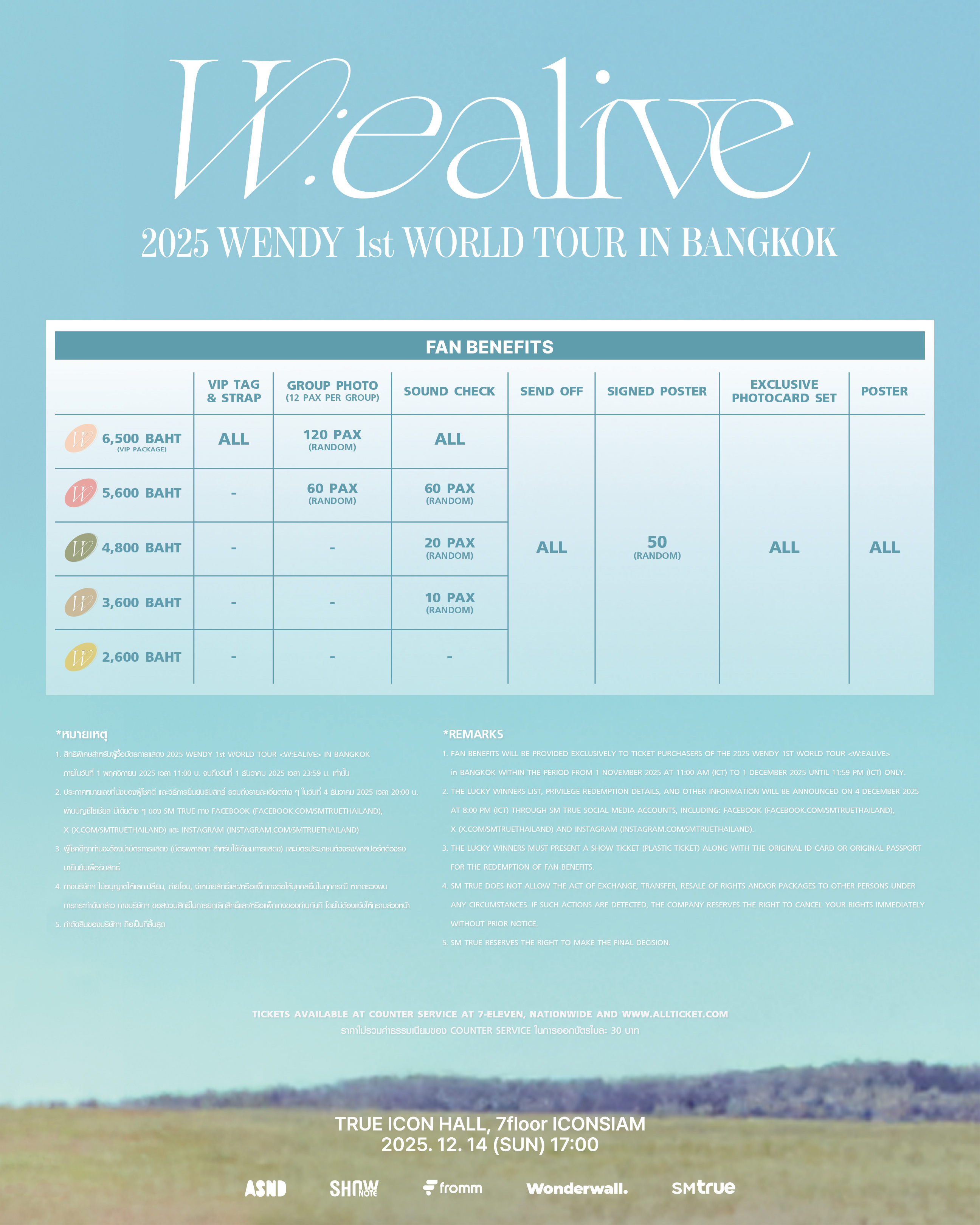 เตรียมท่องไปในเรื่องราวแห่งบทเพลงที่มีเพียงแค่ WENDY (เวนดี้) และ ReVeluv (เรเวเลิฟ) แล้วปล่อยให้ท่วงทำนองกับเสียงร้องของเธอคนนี้ได้โอบกอดทุกคนสักครั้งในชีวิต ด้วยคอนเสิร์ต ‘2025 WENDY 1st WORLD TOUR <W:EALIVE> IN BANGKOK’ เปิดจำหน่ายบัตรรอบสมาชิก JOY CLUB Pre-Sale ในวันเสาร์ที่ 1 พฤศจิกายน 2025 เวลา 11:00 น. – 15:59 น. เท่านั้น และรอบบุคคลทั่วไป ในวันอาทิตย์ที่ 2 พฤศจิกายน 2025 เวลา 11:00 น. เป็นต้นไป ทางเคาน์เตอร์เซอร์วิสในร้าน 7-Eleven ทุกสาขาทั่วประเทศ และทางเว็บไซต์ www.allticket.com/event/WENDY_WEALIVEinBKK บัตรนั่งราคา 6,500 (VIP PACKAGE) / 5,600 / 4,800 / 3,600 / 2,600 บาท พร้อมสิทธิพิเศษสำหรับผู้ซื้อบัตร ติดตามข่าวสารและรายละเอียดเพิ่มเติมของคอนเสิร์ตได้ทางบัญชีโซเชียลมีเดียต่าง ๆ ของ SM True : เฟซบุ๊ก facebook.com/smtruethailand, อินสตาแกรม instagram.com/smtruethailand, เอ็กซ์ x.com/SMTrueThailand และ TikTok (ติ๊กต๊อก) tiktok.com/@smtruethailand สอบถามข้อมูลเพิ่มเติมเกี่ยวกับการซื้อบัตรได้ทาง Counter Service : อีเมล support@allticket.com และไลน์ออฟฟิเชียล @counterservice