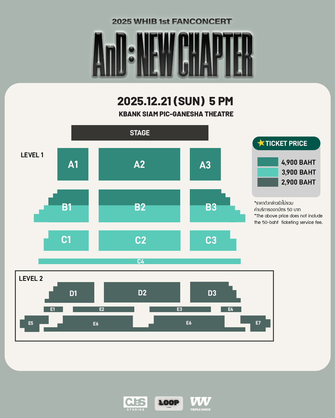 โดยงาน “WHIB 1st FANCON [AnD : New Chapter] In Bangkok” จะเปิดจำหน่ายบัตรในวันอาทิตย์ที่ 30 พฤศจิกายน 2568 ตั้งแต่เวลา 11.00 น. เป็นต้นไป ทางเว็บไซต์ www.triplech.com ราคาบัตรอยู่ที่ 4,900 / 3,900 / 2,900 บาท บัตรทุกราคาจะได้รับสิทธิ์ Hi Touch และโปสการ์ดพิเศษ BKK-Only Postcard (All Member) ที่จัดทำขึ้นเฉพาะแฟนคอนในกรุงเทพเท่านั้น! พิเศษสุดสำหรับผู้ถือบัตรราคา 4,900 บาท รับสิทธิ์ถ่าย Group Photo (7:10) ทุกท่าน พร้อมรับสิทธิ์สุ่มผู้โชคดี 80 ท่าน เพื่อรับโปสเตอร์ที่ศิลปินจะเซ็นให้เองกับมือ ส่วนผู้ถือบัตรราคา 3,900 บาท ก็มีสิทธิ์ลุ้นรับโปสเตอร์ที่ศิลปินจะเซ็นให้เองกับมือเช่นกันอีก 20 ท่าน และได้รับสิทธิ์สุ่มถ่าย Group Photo (7:10) จำนวน 50 ท่านด้วย