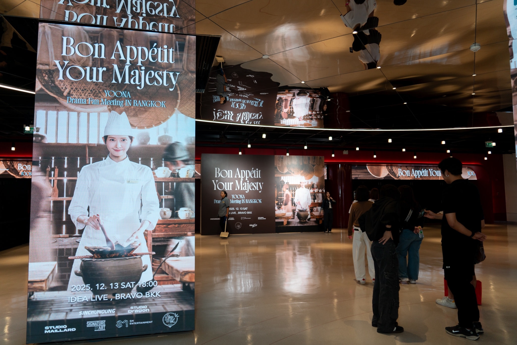 สถานที่จัดงาน IDEA LIVE BRAVO BKK เริ่มคึกคักตั้งแต่บ่ายวันเสาร์ที่ 13 ธันวาคม 2568 เพราะบรรดาคนรักอิมยุนอาต่างตื่นเต้นมาร่วมเก็บบรรยากาศหน้างานและรอเข้าชมงาน “Bon appétit, Your Majesty” YOONA Drama Fan Meeting กันอย่างหนาแน่น เมื่อถึงเวลาที่ทุกคนรอคอย อิมยุนอา ในบทบาท หัวหน้าห้องเครื่อง ยอนจียอง ก็ได้ออกมาทักทายทุกคน พร้อมเล่าเรื่องราวความสนุกสนานและน่าประทับใจกับการถ่ายทำ ซีรียส์เรื่อง “Bon appétit, Your Majesty เมนูรักพิชิตใจราชา” ซีรียส์สุดร้อนแรงในปีนี้ ต่อกันด้วยเกมที่แฟนคลับได้มีส่วนร่วมกับอิมยุนอา ทั้งเกมทายใจ และเกมทายท่าทาง ซึ่งสนุกสนานทั้งคนดูและอิมยุนอากันเลยทีเดียว แถมยังมีช่วง Photo Time ให้คนดูทุกคนได้เก็บภาพน่ารักๆ ของอิมยุนอากันอย่างเต็มอิ่ม ไฮไลท์น่าจะอยู่ที่เมนูขนมหวานไทยที่ทาง อิมยุนอา ได้ตั้งใจเตรียมทำเป็นพิเศษเพื่อมาเสิร์ฟแฟนคลับไทยโดยเฉพาะ อย่างเมนูขนมหวานขึ้นขื่อ ของไทย อย่างบัวลอย ที่งานนี้มีผู้โชคดี ได้รับเมนูนี้ ไปทานเพื่อพิสูจน์ฝีมือทำอาหารระดับหัวหน้าห้องเครื่อง ยอนจียอง กันอีกด้วย งานนี้นอกจากจะมาเสิร์ฟความสนุกแล้ว อิมยุนอา ยังเตรียมเพลงมาฝากแฟนๆ ชาวไทยถึง 2 เพลง กับเพลง “I find you” เพลงประกอบซีรียส์ “Bon appétit, Your Majesty เมนูรักพิชิตใจราชา” และเพลง “Deoksugung Stonewall Walkway” เพลงน่ารัก จังหวะสนุกๆ ปิดท้ายงานได้อย่างสมบูรณ์แบบ แต่ความสนุกยังไม่จบแค่นั้น ยังมีกิจกรรม Hibye กับผู้โชคดี สร้างรอยยิ้มและความประทับใจส่งคนดูกลับบ้านไปแบบเต็มอิ่ม
