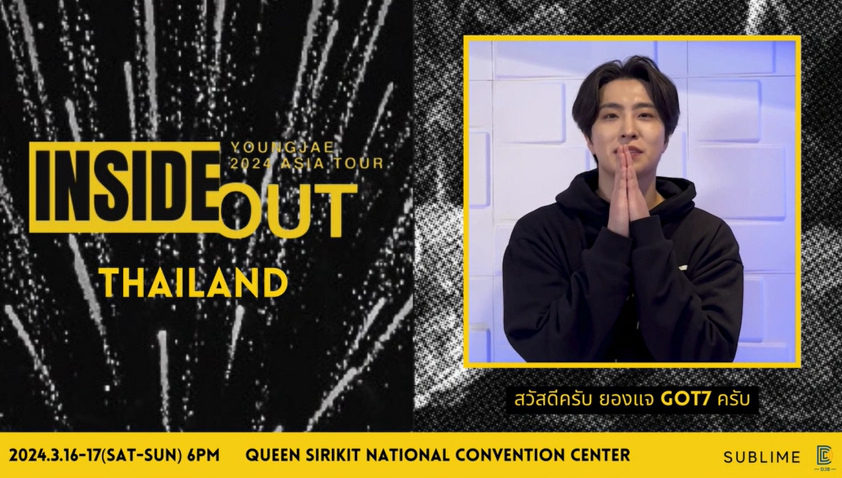หนุ่มยองแจ ฝากคลิปถึงแฟนๆ ชาวไทย “สวัสดีครับ ยองแจ GOT7 ครับ ได้เจอกับแฟนๆ ครั้งแรกของปี 2024 สำหรับงาน 2024 YOUNGJAE ASIA TOUR <INSIDE OUT> CONCERT in THAILAND ตอนนี้ก็ได้