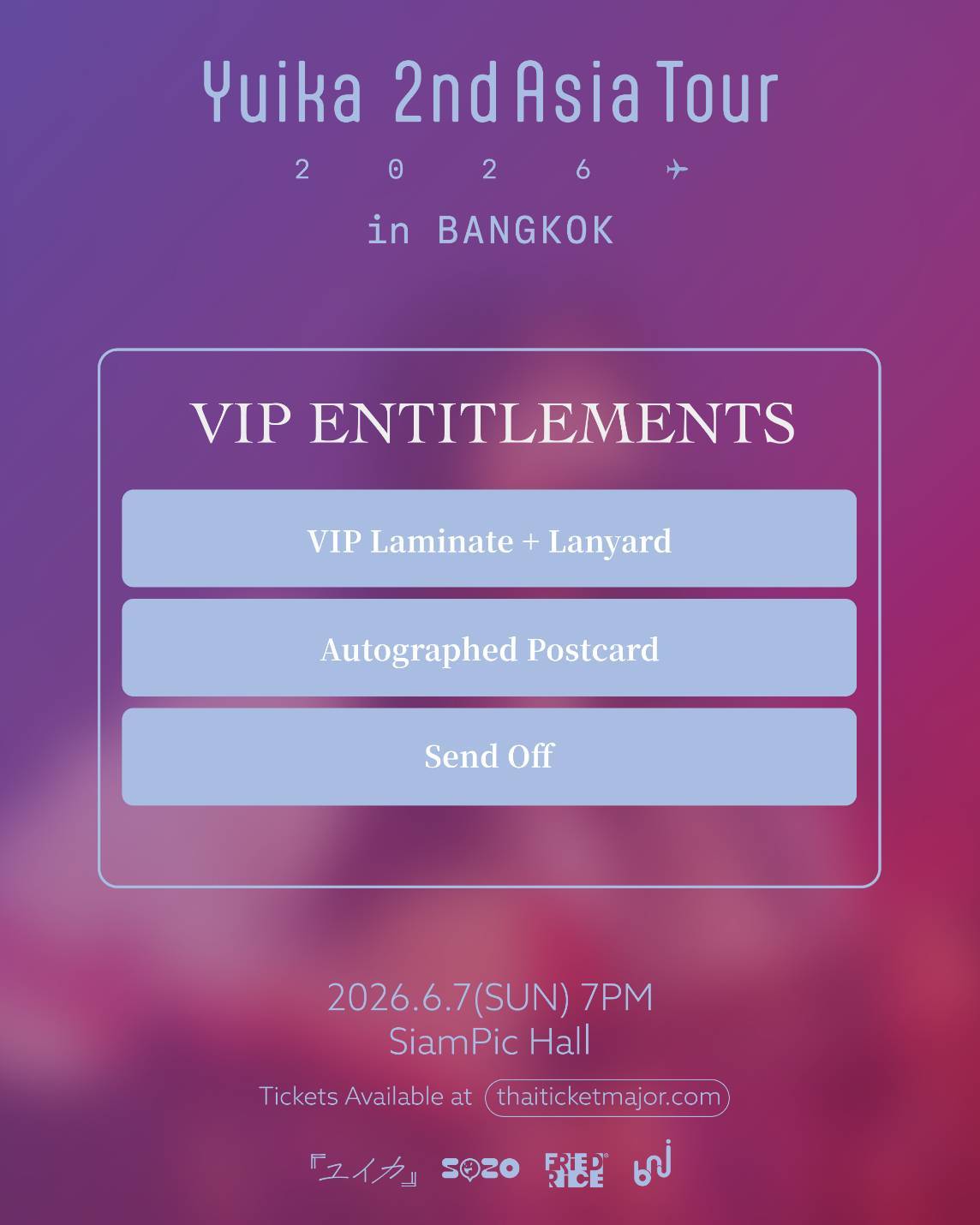 สำหรับการมาเยือนประเทศไทยครั้ งนี้ แฟนเพลงจะได้สัมผัสเสน่ห์ของเสี ยงร้องที่เป็นเอกลักษณ์ ไม่ว่าจะเป็นเพลงฮิตที่ทำให้ เธอเป็นที่รู้จัก รวมถึงบทเพลงจากอัลบั้มแรก ที่จะถูกถ่ายทอดผ่ านการแสดงสดอย่างใกล้ชิ ดในบรรยากาศสุดพิเศษ ค่ำคืนแห่งเสียงดนตรีและเรื่ องราวความรักในแบบของ Yuika (ยูอิกะ) กำลังจะเกิดขึ้นที่กรุงเทพฯ และรับรองว่าจะเป็นอีกหนึ่ งคอนเสิร์ตที่แฟน J-POP ไม่ควรพลาด!! แฟน ๆ ที่ไม่อยากพลาด สามารถเตรียมตัวจับจองบัตรได้ ในวันเสาร์ที่ 28 มีนาคม 2569 เวลา 10.00 น. เป็นต้นไป ผ่านทางเว็บไซต์ Thaiticketmajor บัตรราคา VIP 5,800 บาท / 4,500 บาท / 3,200 บาท