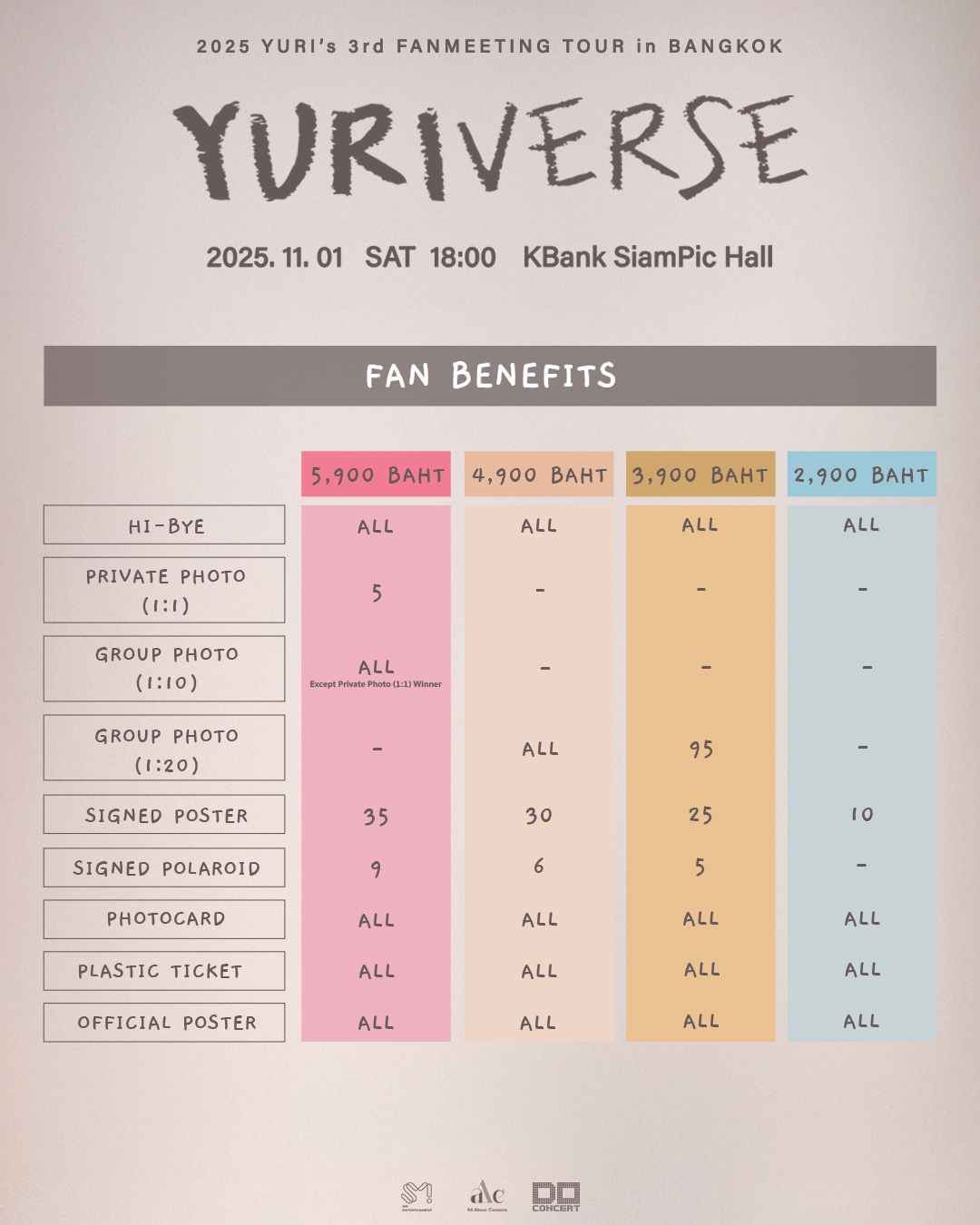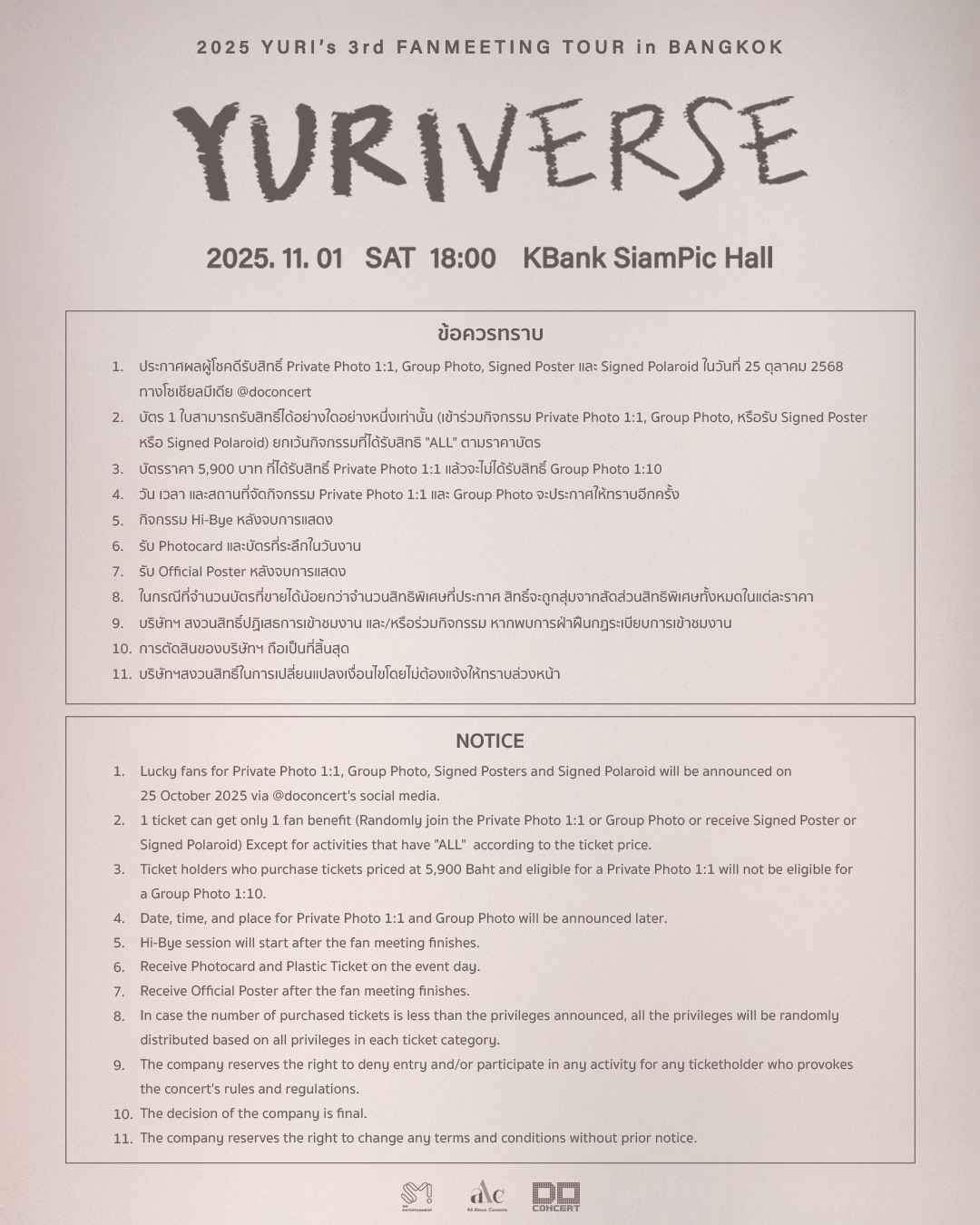 𝟐𝟎𝟐𝟓 𝐘𝐔𝐑𝐈’𝐬 𝟑𝐫𝐝 𝐅𝐀𝐍𝐌𝐄𝐄𝐓𝐈𝐍𝐆 𝐓𝐎𝐔𝐑 <𝐘𝐔𝐑𝐈𝐕𝐄𝐑𝐒𝐄> 𝐢𝐧 𝐁𝐀𝐍𝐆𝐊𝐎𝐊 วันเสาร์ที่ 1 พฤศจิกายน 2568 เวลา 18:00 น. ที่เคแบงก์สยามพิฆฮอลล์ บัตรราคา 5,900 / 4,900 / 3,900 / 2,900 บาท พร้อมสิทธิพิเศษ Hi-Bye ทุกที่นั่ง สามารถซื้อบัตรที่ได้ที่ Do Concert Ticket หรือ https://bit.ly/YURIVERSEinBKK และสามารถติดตามทุกความเคลื่ อนไหวของกิจกรรมได้ที่แฮชแท็ก #YURIVERSEinBKK